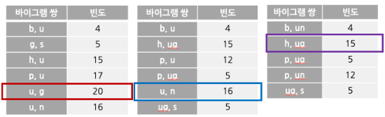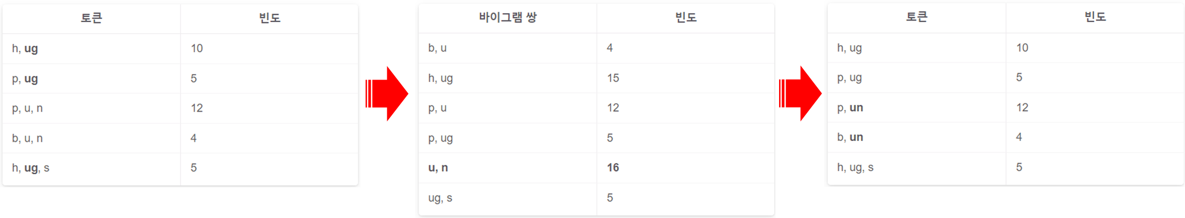 4. 가장 많이 등장한 바이그램쌍을 합쳐 집합에 추가 (위를 예로 들면 u, g를 합친 ug를 바이그램에 추가)