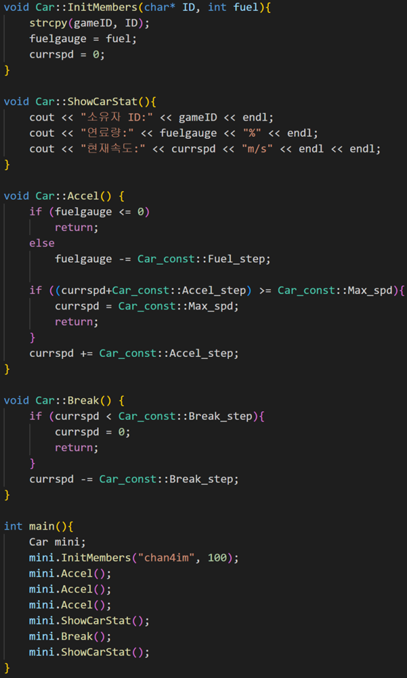 - 클래스 정의: Car.cpp 처럼 멤버함수의 정의와 소스파일을 저장, 컴파일 되도록 한다.