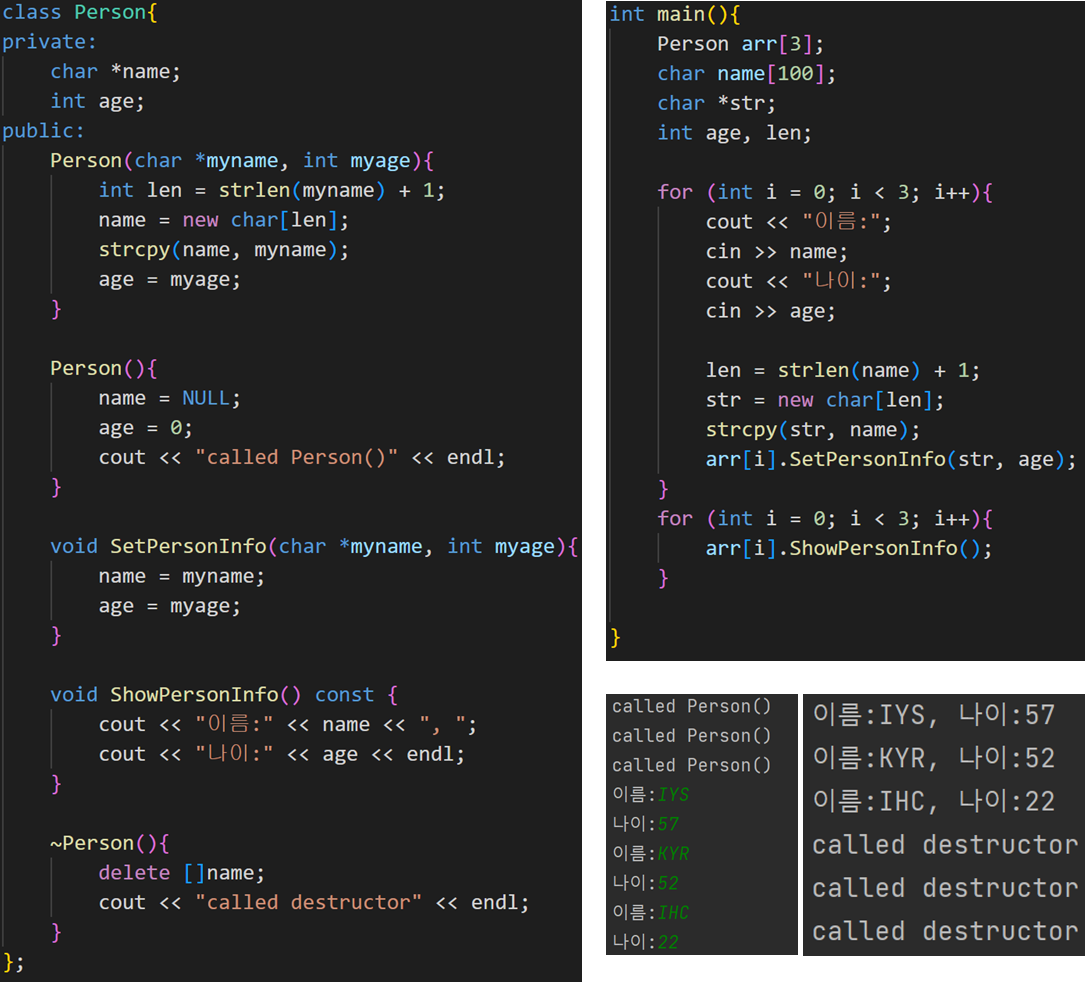 - 생성자에서 new로 할당한 메모리 공간을 소멸자에서 delete로 소멸시킨다.