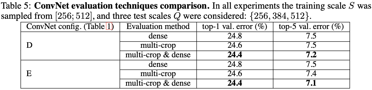 -Fully-Convolutional network가 전체 image에 적용되기에 test에서 여러 결과를 sampling할 필요가 없으며 각 결과에 대한 network의 재계산이 필요하기에 효율성이 떨어지게 된다.동시에 Szegedy 등(2014)이 수행한 것처럼 대규모 결과셋을 사용하면 Fully-Convolutional network에 비해 input image를 더 미세하게 샘플링할 수 있기 때문에 정확도가 향상될 수 있다. - 또한 multi-crop evaluation은 convolution boundary가 다르기에 dense evaluation을 보완한다. ConvNet을 crop에 적용할 때, Convolution feature map은 zero-padding된다. 하지만 dense evaluation의 경우, 동일한 crop에 대한 padding은 image의 인접부분(neighbouring part)에서 자연스레 발생하며 이는 전체 network receptive field를 상당히 증가시키기에 더 많은 context가 captured된다. - 실제로 여러 결과의 계산시간증가가 잠재적 정확도 향상을 정당화하지는 않는다고 믿는다. 다만 우리는 scale당 50개의 crops(5x5의 regular grid와 2 flips)을 사용해 network를 평가하는데, 이는 Szegedy(2014)등이 사용한 4개 이상의 scale의 144개의 결과물과 비교할 수 있다.