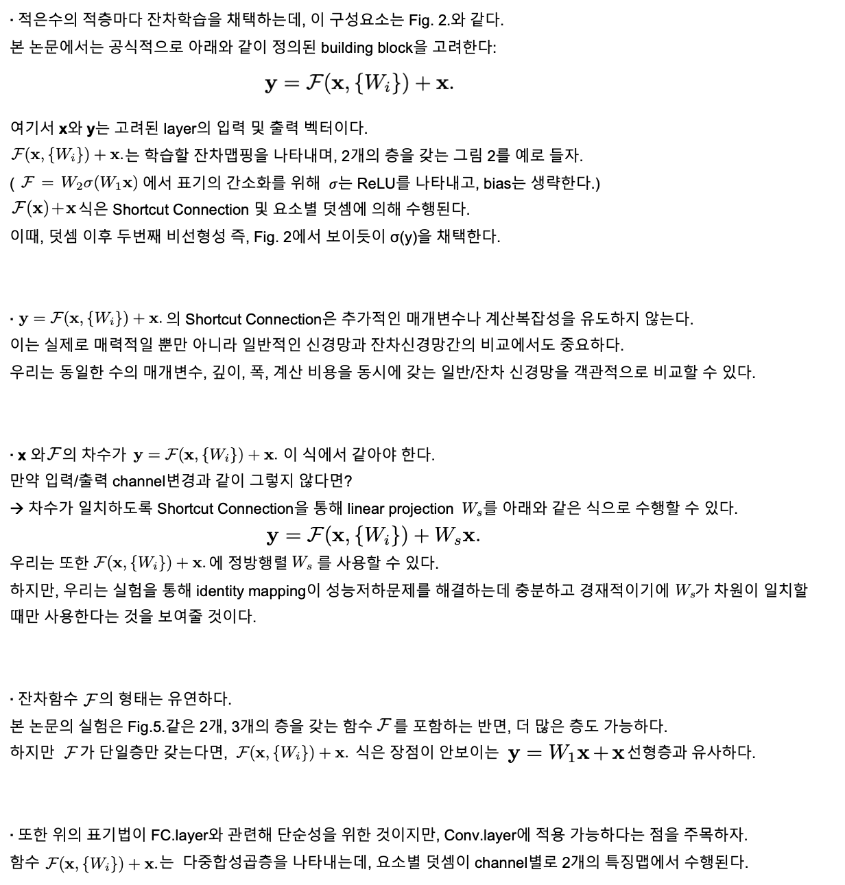 - ๊ฐ ๋ช ๊ฐ์ ์ ์ธต(stacked layer)์ด ์ํ๋ ๊ธฐ๋ณธ์ ๋งตํ์ ์ง์ ๋ง์ถ๊ธฐ(fit)๋ฅผ ๋ฐ๋ผ๋ ๋์ , ์ด๋ฌํ layer๊ฐ ์์ฐจ๋งตํ์ ์ ํฉํ๋๋ก ๋ช ์์ ์ผ๋ก ํ์ฉํ๋ค.