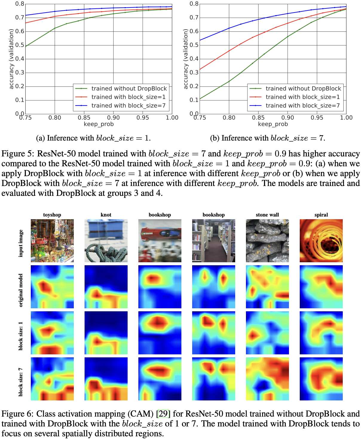 ๊ทธ๋ฆผ 5์ ๋ น์ ๊ณก์ ์ ์ถ๋ก ์ค์ keep_prob๊ฐ ๊ฐ์ํจ์ ๋ฐ๋ผ validation accuracy๊ฐ ๋น ๋ฅด๊ฒ ๊ฐ์ํจ์ ๋ณด์ฌ์ค๋ค.์ด๊ฒ์ DropBlock์ด semantic์ ๋ณด๋ฅผ ์ ๊ฑฐํ๊ณ ๋ถ๋ฅ๋ฅผ ๋ ์ด๋ ต๊ฒ ํ๋ค๋ ๊ฒ์ ์์ฌํ๋ค.