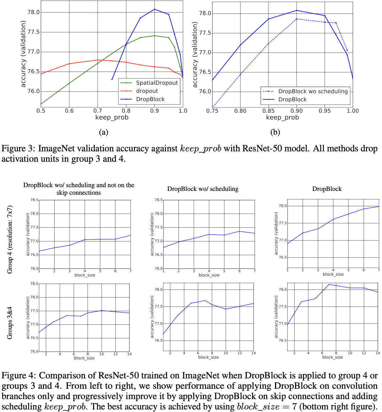 ResNet-50 ์ DropBlock์ ์ถ๊ฐํ๋ฉด ImageNet์ Image Classification์ ์ ํ๋๊ฐ 76.51%์์ 78.13%๋ก ํฅ์๋๋ค.
