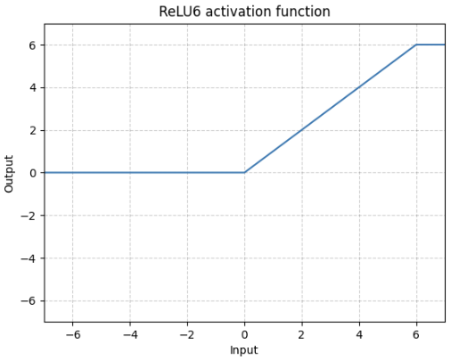ReLU6 - f(x) = clip(x, 0, 6) - 데이터가 많을 수록 좋은 함수 - 기울기가 1인 폭이 좁아서 데이터가 적으면 0으로 모두 죽어버릴 수 있다.