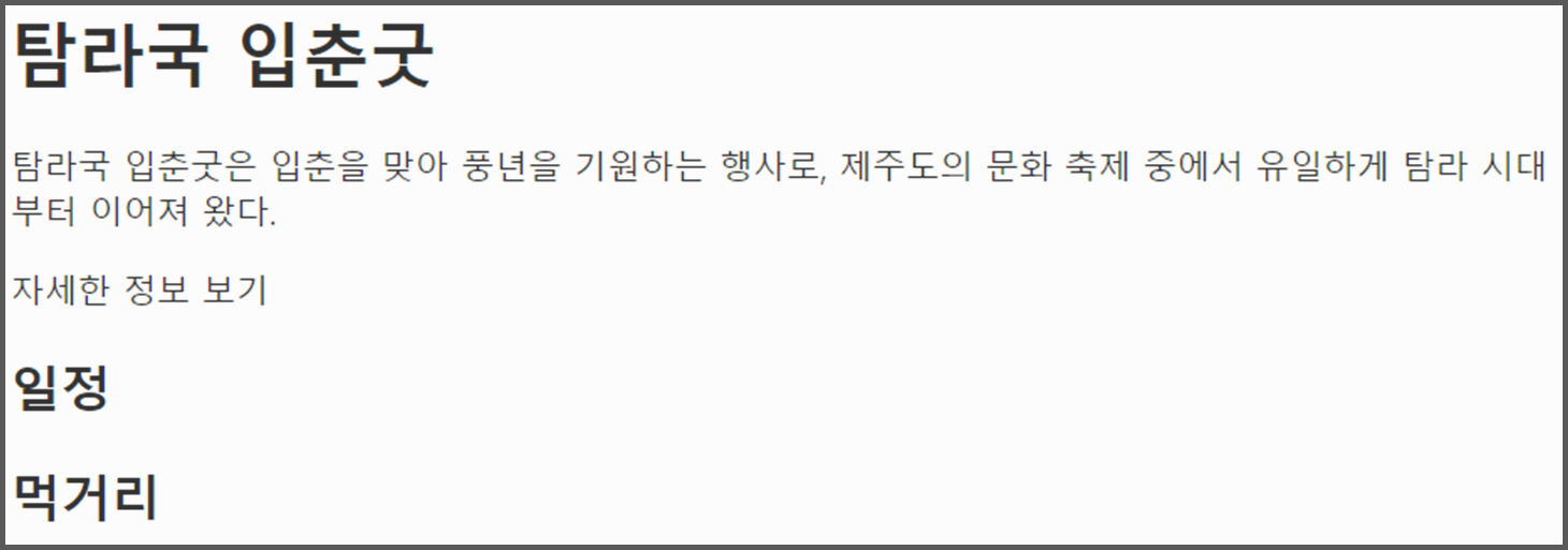 <p>탐라국 입춘굿은 입춘을 맞아 풍년을 기원하는 행사로, 제주도의 문화 축제 중에서 유일하게 탐라 시대부터 이어져 왔다.</p>