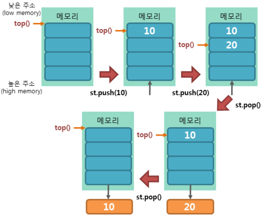 stack 컨테이너는 stack 메모리구조 표현을 위해 다음과 같은 멤버 함수를 제공한다.
