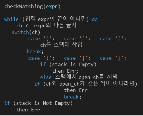 // 오른쪽 괄호를 만나는 경우 stack의 top과 비교