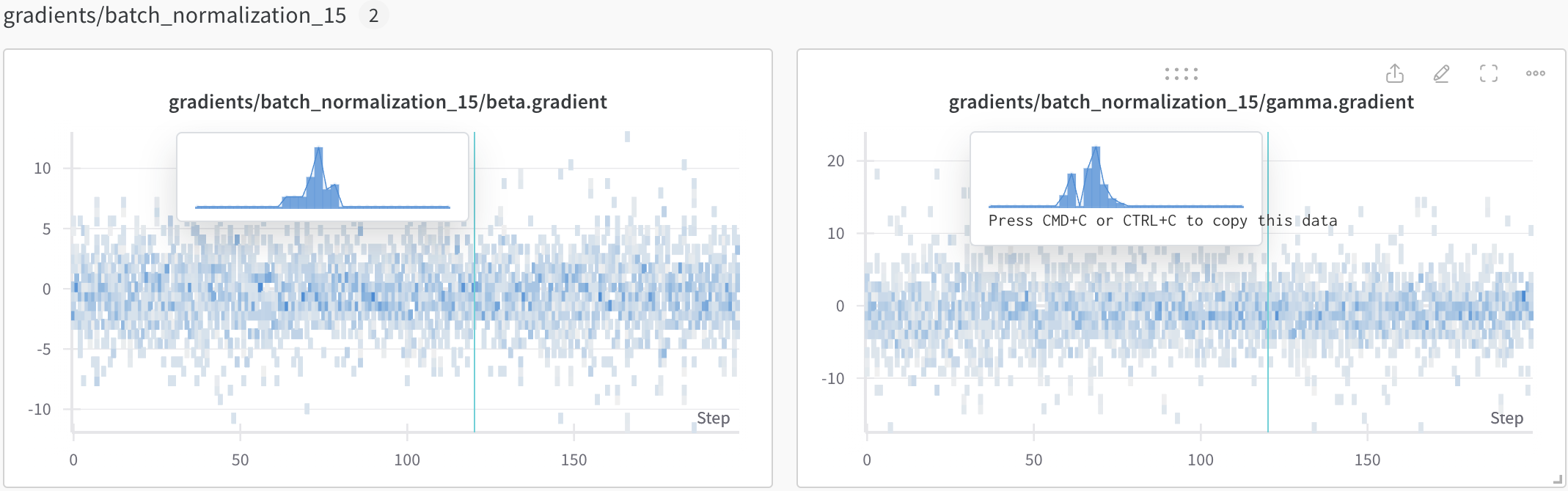 ์ถ๊ฐ์ ์ผ๋ก ํด๋น epoch์ ๋ํ gradient distribution์ ๊ฒฝ์ฐ ๋ง์ฐ์ค๋ฅผ ๊ฐ์ ธ๋ค ๋์ผ๋ฉด ์์ ๊ทธ๋ฆผ์ฒ๋ผ ํ์ธ๊ฐ๋ฅํ๋ค.