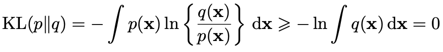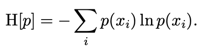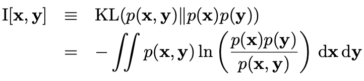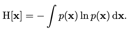 H[x]๋ x์ entropy๋ก ํ๊ท ์ ๋ณด๋ ์ฆ, p(x)์ ๊ธฐ๋๊ฐ์ ์๋ฏธ cf) H[x, y] = H[y|x] + H[x]๋ฅผ ๋ง์กฑ.