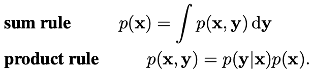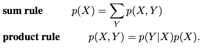 ์ด์ , ์ด๋ ๊ฒ ๊ฐ๋จํ ํ๊ธฐ๋ฒ์ ์ด์ฉํ๋ฉด ํฉ๊ณผ ๊ณฑ์ ๋ฒ์น์ ์๋์ ๊ฐ์ด ํํ๊ฐ๋ฅํ๋ค:โ p(X,Y): ๊ฒฐํฉํ๋ฅ (joint probability), 'X์ Y์ ํ๋ฅ '.
