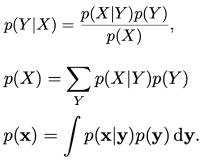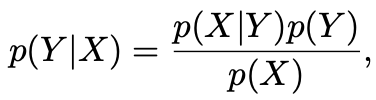 ๊ณฑ์ ๋ฒ์น๊ณผ ๊ฒฐํฉํ๋ฅ ์ ๋์นญ์ฑ ์ฑ์ง์ ์ด์ฉํด ์กฐ๊ฑด๋ถ ํ๋ฅ ๋ก๋ถํฐ ์๋ ์์์ ์ป์ ์ ์๋๋ฐ, ์ด๋ฅผ ๋ฒ ์ด์ฆ ์ ๋ฆฌ(Bayes' Theorem)์ด๋ผ ํ๋ค. ์ข๋ณ์ ์กฐ๊ฑด๋ถ๋ถํฌ P(Y|X)์ ์ฐ๋ณ์ p(X | Y)๊ฐ์ ๊ด๊ณ๋ฅผ ๋ํ๋ธ๋ค๋ ๊ฒ์ ์ฃผ๋ชฉํ ๋, ํฉ์ ๋ฒ์น์ ์ฌ์ฉ, ๋ฒ ์ด์ฆ ์ ๋ฆฌ์ ๋ถ๋ชจ๋ฅผ ๋ถ์์ ๋ํ๋ ์์ผ๋ก ํํํ ์ ์๋ค:
