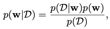 [p(D|w)์ ๋ํ ์ ๊ทผ๋ฐฉ์]: ํ๋์ dataset D๋ง ์กด์ฌํ๋ฉฐ (์ฆ, ์ค์ ๋ก ๊ด์ธก๋ ๋ฐ์ดํฐ), ๋งค๊ฐ๋ณ์์ ๋ํ ๋ถํ์ค์ฑ์ w์ ๋ํ ํ๋ฅ ๋ถํฌ๋ฅผ ํตํด ํํ