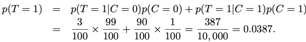 ํฉ์ ๋ฒ์น์ ์ด์ฉํ๋ฉด, p(C = 0|T = 1) = 1 - 90/387 = 297/387 ≈ 0.77์ด ๋์ด, ์์ด ์๋ค๋ ํ๋ฅ ์ 77%๊ฐ ๋๋ค.