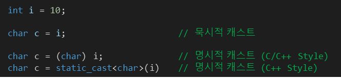 - 명시적 캐스트 (explicit cast): 캐스트 연산자를 사용하여 형변환이 이뤄지는 경우