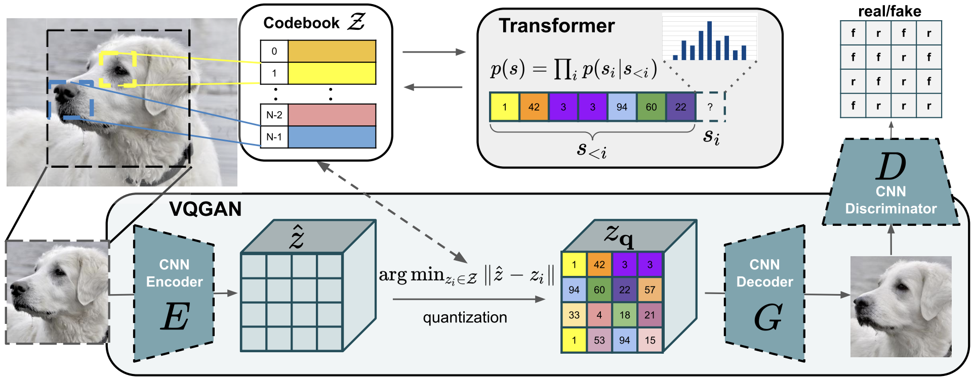 VQ-GAN은 위 그림구조와 같으며, VQ-VAE구조에 몇가지 주요변경사항을 적용한다: