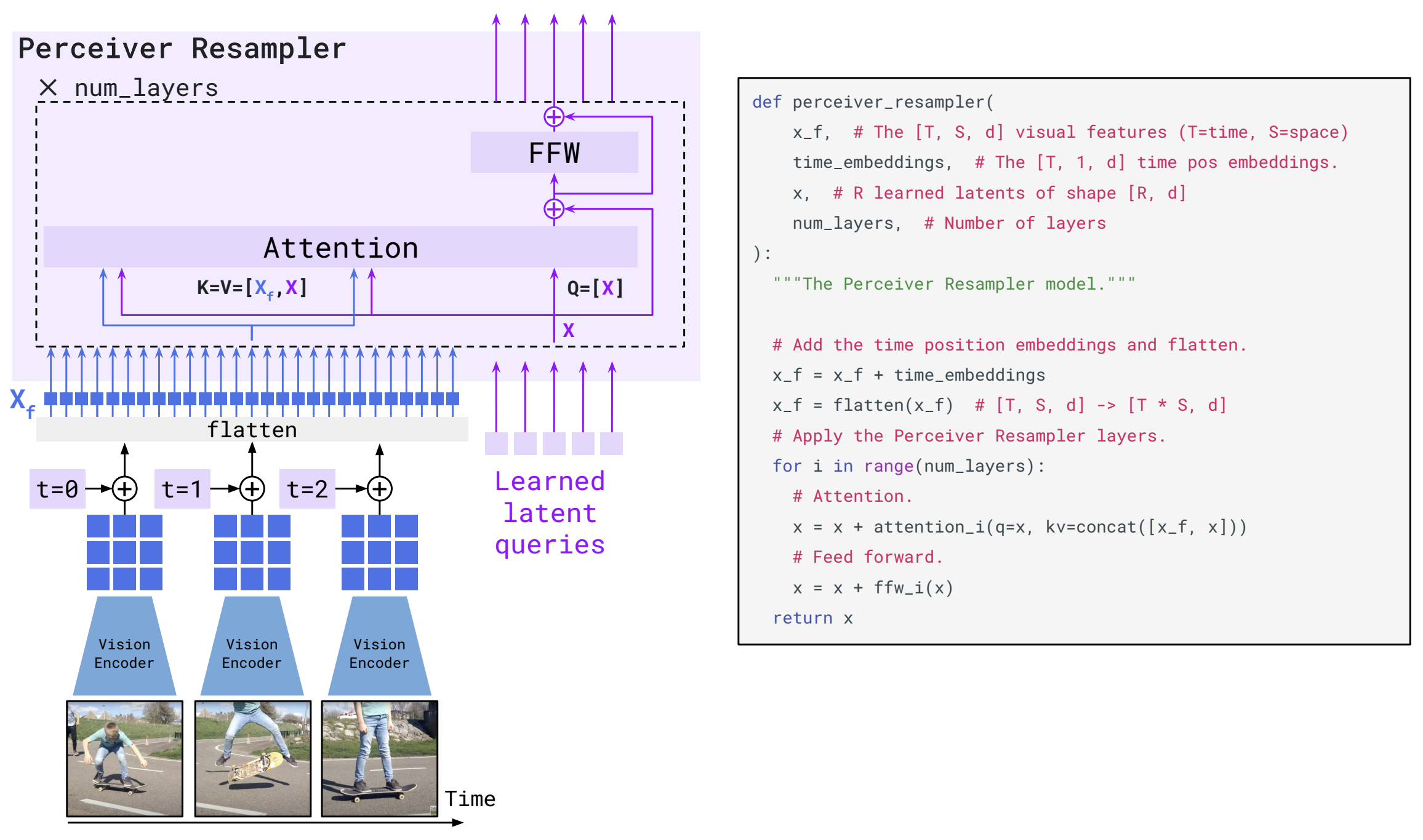 Vision Encoder의 출력은 feature의 2D grid로 Perceiver Resampler로 전달전에 1D벡터로 펼쳐진다. cf) Video는 각 snapshot을 vision encoder에 독립적으로 통과시킨 후 여러 feature grid를 생성.