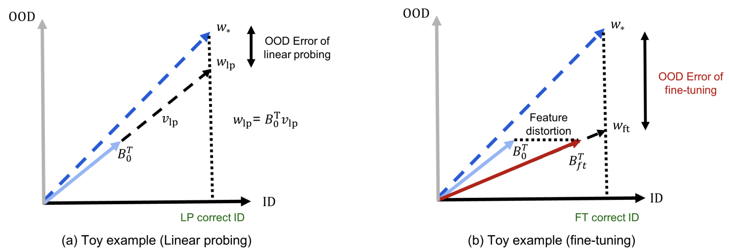 이때, Fine-Tuning 학습이 진행되면서 ID Subspace의 방향의 gradient ≠ 0 이기에 Feature Distortion이 발생하며, 이는 더 높은 OOD error를 유발한다. v: linear head, B: Feature Extractor좌측, 우측 모두 ID방향의 정사형은 모두 같음을 볼 수 있음 우측, Fine-Tuning의 경우, ID-subspace의 직교방향으로는 변하지 않음을 알 수 있음. 즉, Feature Extractor를 학습시키면 ID subspace와 평행하게 update가 됨을 알 수 있으며, 이때 Feature distortion이 발생함이 관찰된다.