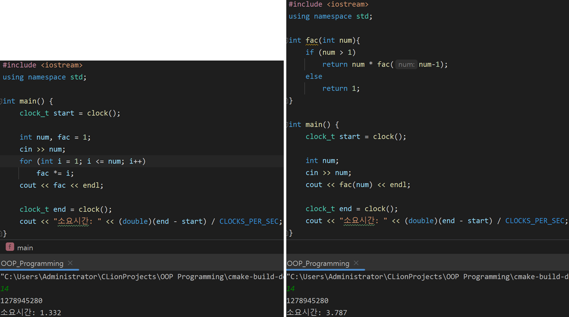 이렇게 반복에 비해 알고리즘을 훨씬 명확하고 간결하게 나타낼 수 있다는 장점이 있으나 아래와 같이 수행속도면에서는 현저히 떨어지는 것을 볼 수 있다.