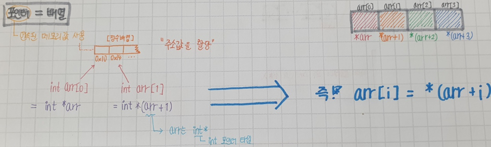 다만, 포인터는 연속된 메모리값을 사용하는데, 이때 배열이 포인터로 붕괴하기에 배열과 포인터가 같다 이해하고 사용하는 것이다.