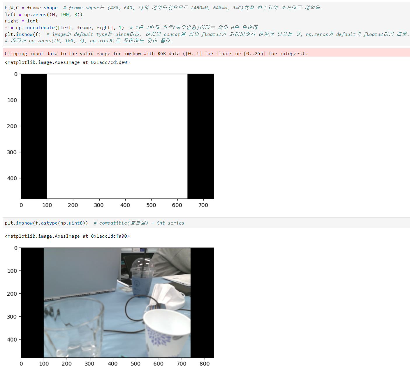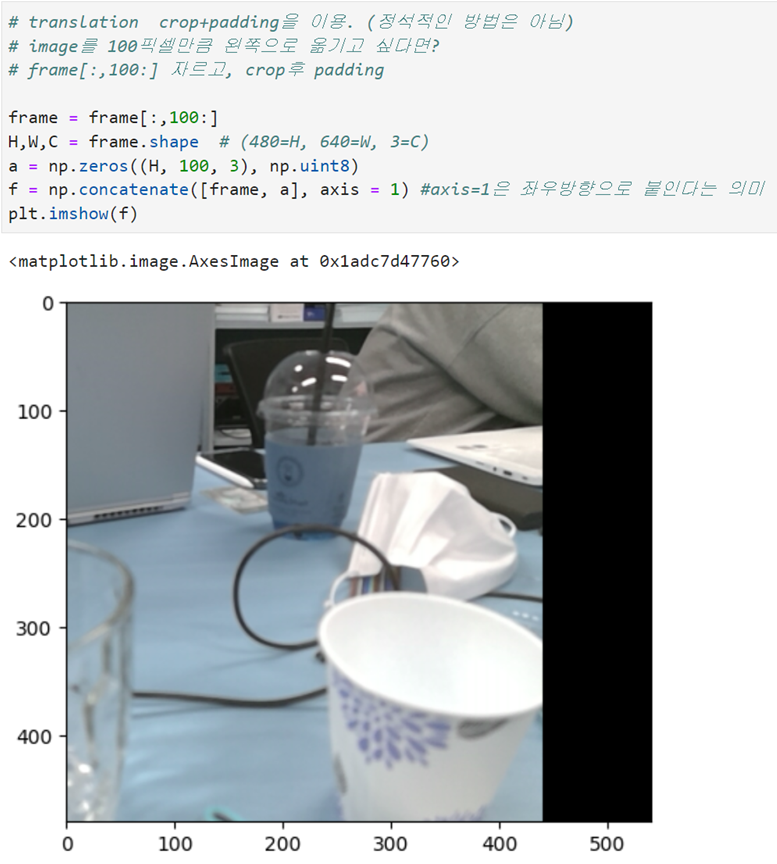 - frame을 slicing을 이용한 crop으로 자름 => [:, 100:]