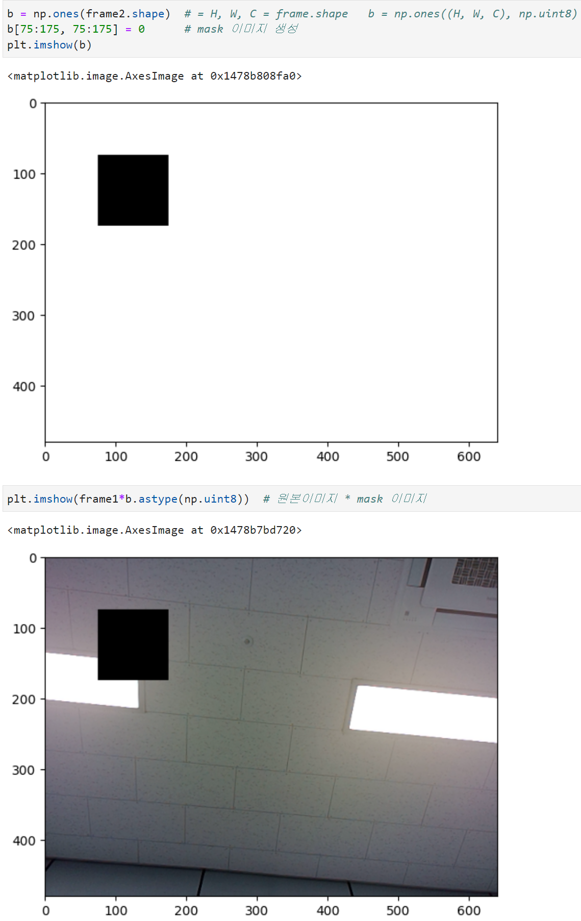 사각형 마스킹 구현방식 : 마스크 이미지[밝은 부분을 1, masking 부분을 0으로 만들어] 원본이미지와 곱한다.