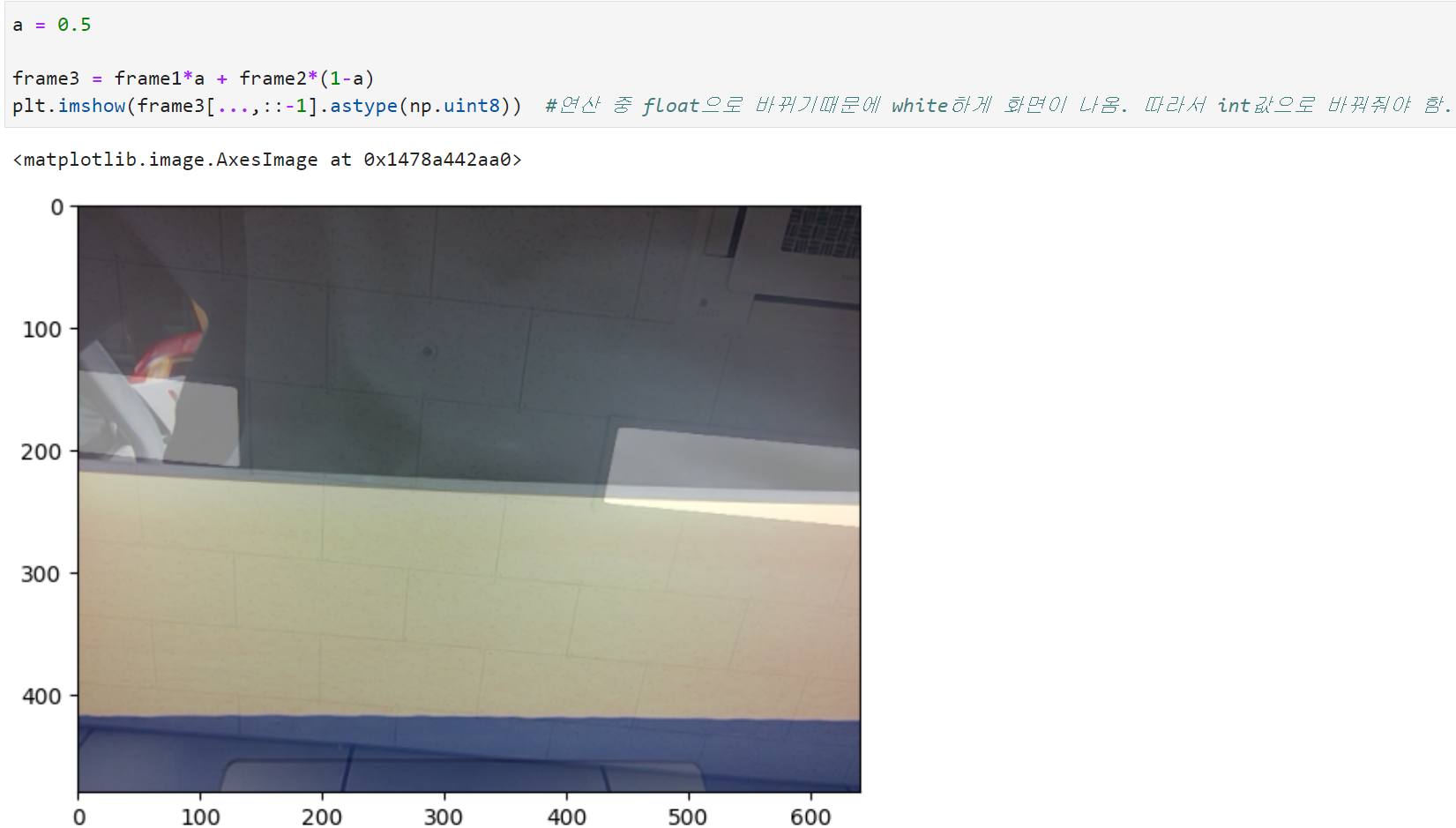 구현방식 : alpha blending 식: frame1 x a + frame2 x (1-a)