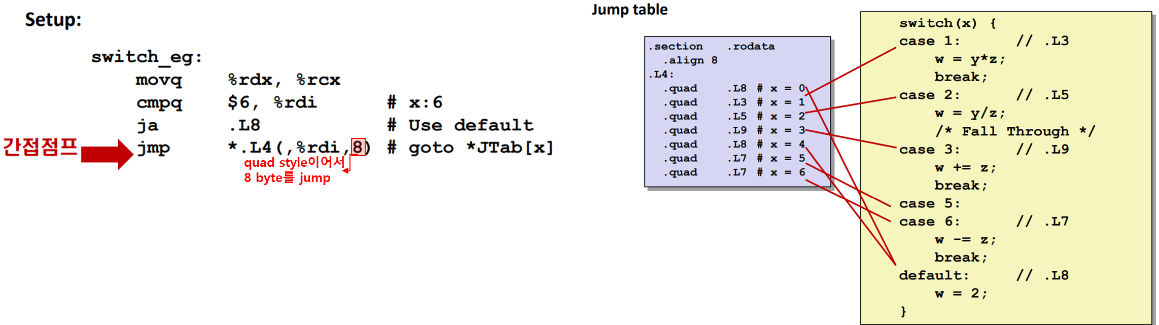 ▷ 간접 점프: jmp *.L4(, %rdi, 8)