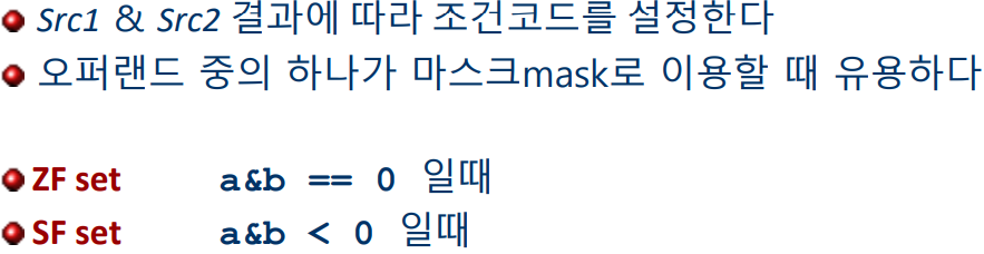 testq Src2, Src1 로 표기하며 이때, Src1 & Src2 연산을 진행하여 비교한다.