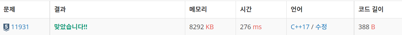 백만자리라는 문제를 안읽고 풀어서 틀렸다. lon long을 써줘야 함.