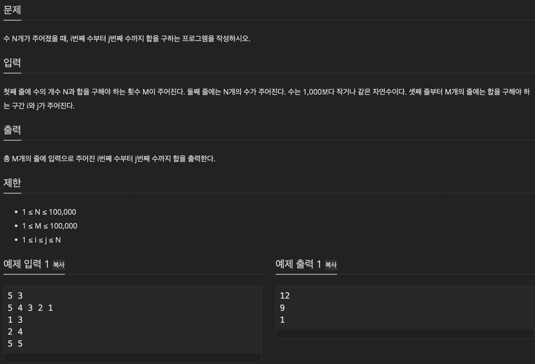 부분 합 개념을 이용해서 풀 때, 부분 합을 계산한 배열을 i, j로 순차적으로 접근할 경우