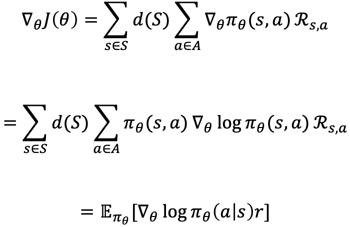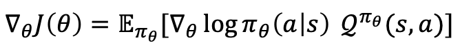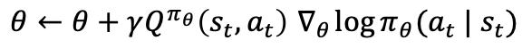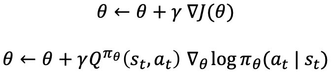 이 수식에서도 이전 MLE의 경사하강법 수식처럼 γ의 추가로 Q𝛑θ(st, at)가 기울기 앞에 붙어 학습률역할을 하는 것을 볼 수 있다. 따라서 보상의 크기에 따라 해당 행동을 더욱 강화하거나 반대 방향으로 부정할 수 있게 되는 것이다. 즉, 결과에 따라 동적으로 학습률을 알맞게 조절해준다고 이해할 수 있다.