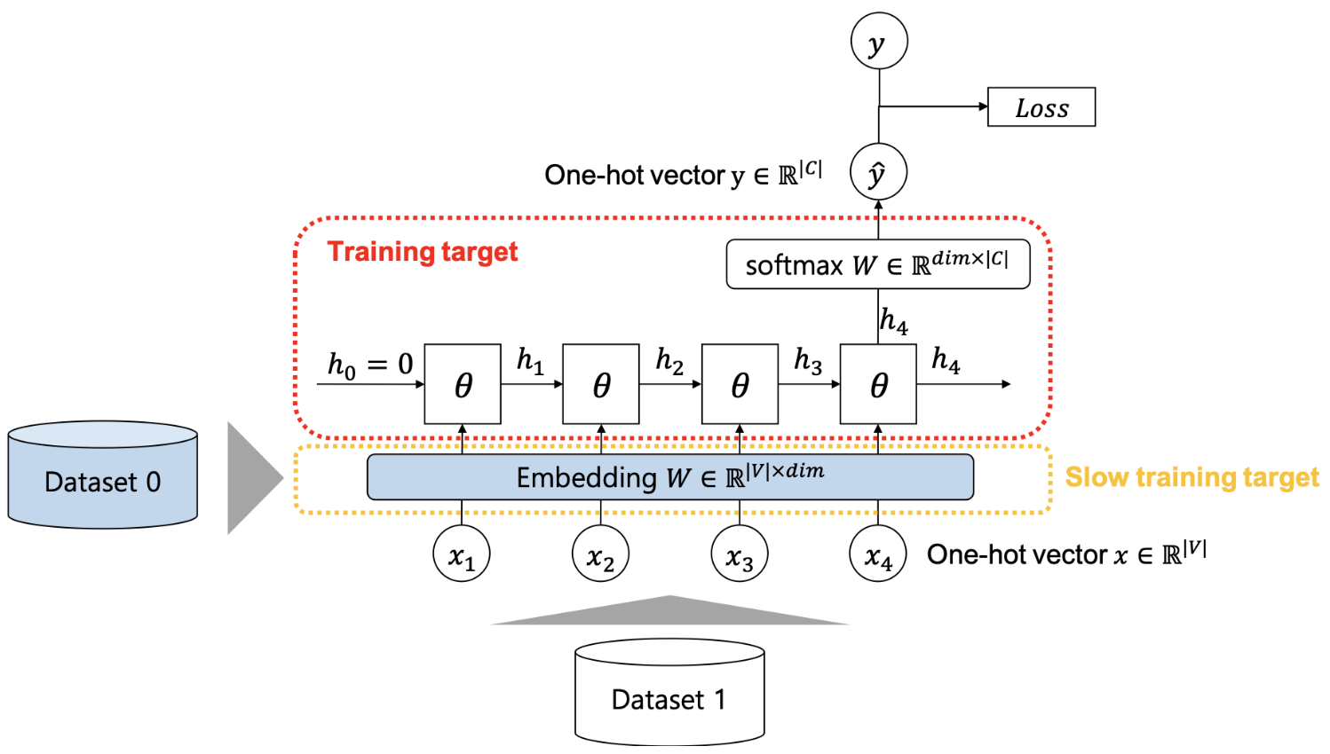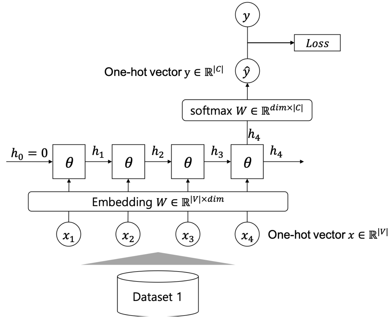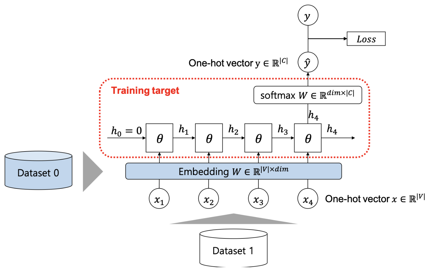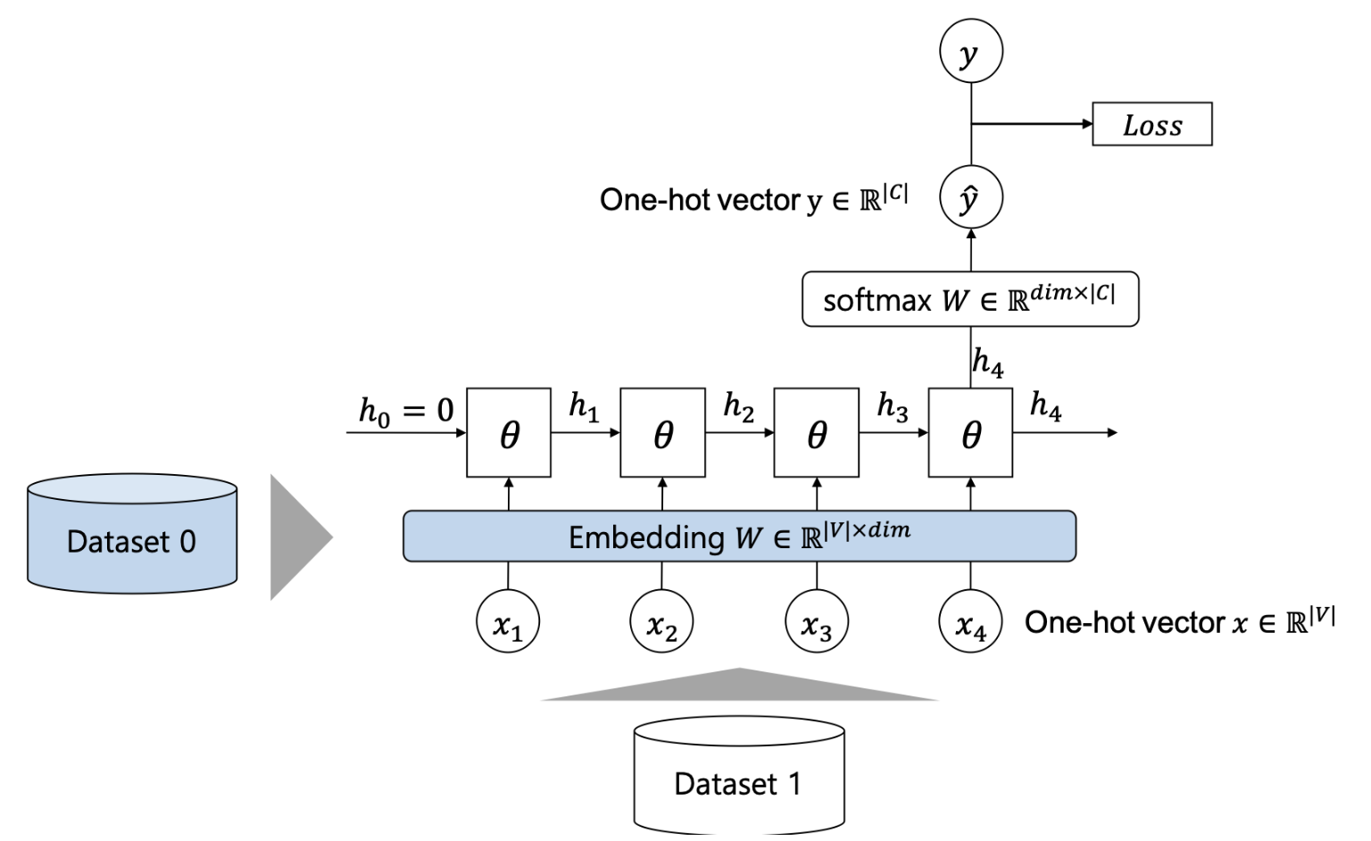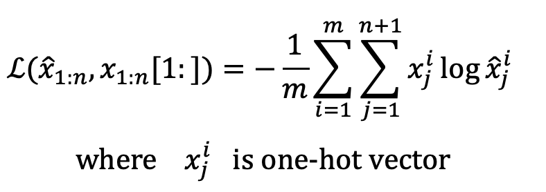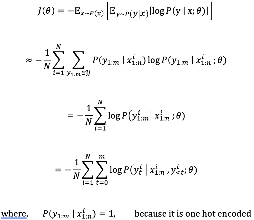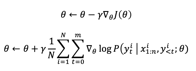 그렇다면 sequence x1:n과 y1:m은 B라는 dataset에 존재한다. 목표) 실제함수 f: x→y를 근사하는 신경망 parameter θ를 찾는것이므로 이제 해당 함수를 근사하기 위해 parameter θ를 학습해야한다. θ는 아래와 같이 MLE로 얻을 수 있다. Dataset B의 관계를 잘 설명하는 θ를 얻기위해, 목적함수를 아래와 같이 정의한다. 아래 수식은 Cross-Entropy 를 목적함수로 정의한 것이다. 목표) 손실함수의 값을 최소화 하는 것. 앞에서 정의한 목적함수를 최소화 해야하므로 Optimizer를 통해 근사할 수 있다. (아래 수식은 Optimizer로 Gradient Descent를 사용하였다.)