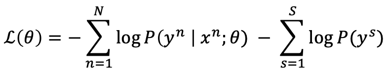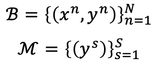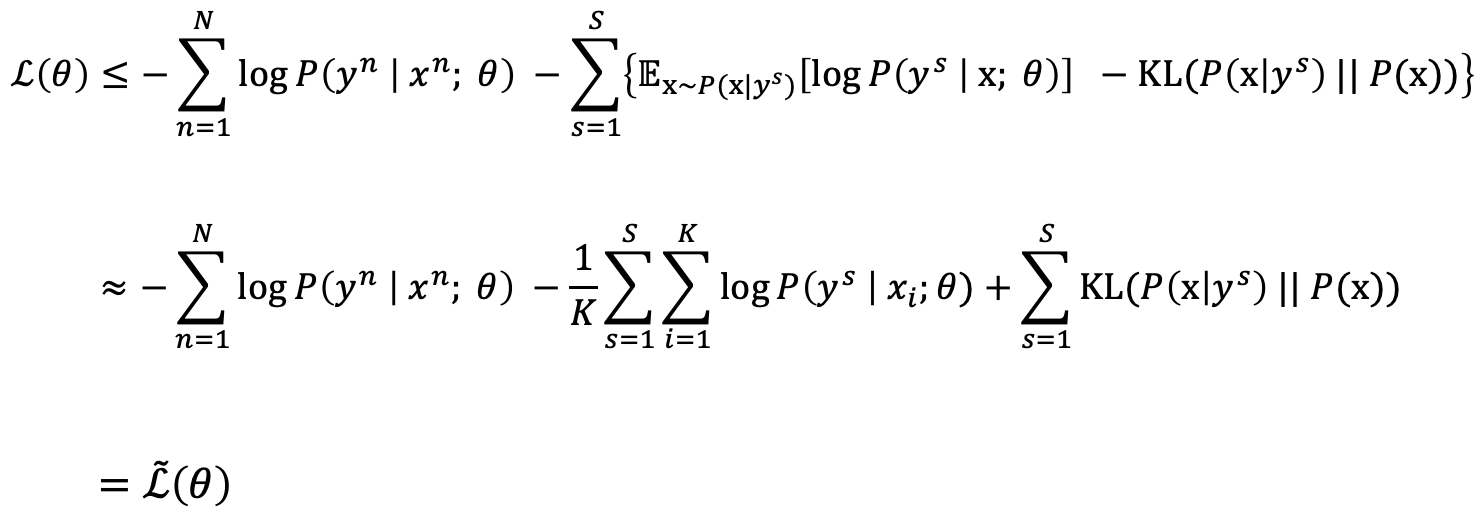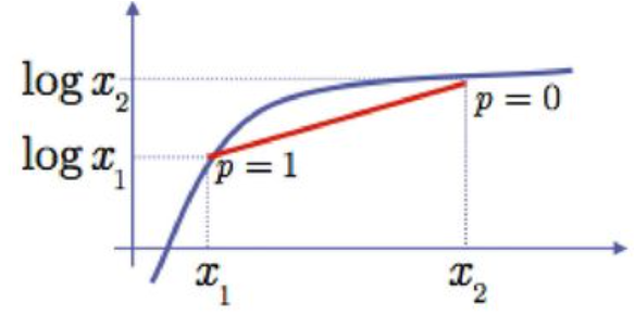 ∙ N개의 src문장 x, tgt문장 y로 이뤄진 양방향병렬코퍼스 𝛣와 ∙ S개의 tgt문장 y로만 이뤄진 단일언어코퍼스 ℳ이 있다고 가정하자. 앞서 다룬 DUL(Dual Unsupervised Learning)처럼 최종적으로 최소화하려는 손실함수는 아래와 같이 표현가능하다. 여기서, DUL과 마찬가지로 P(y)는 주변분포의 속성을 활용해 표현가능하다. 다만, 여기서 좌변이 P(y)가 아닌 logP(y)임을 주목하자. cf) Jensen's 부등식정리는 항상 log P(y)보다 작거나 같은 수식으로 정리할 수 있다. [Jensen's 부등식 정리] 로그함수곡선이 아래와 같을 때, 두점 x1, x2에 대한 평균을 xm이라 하자.