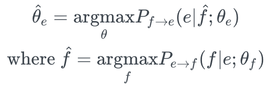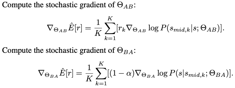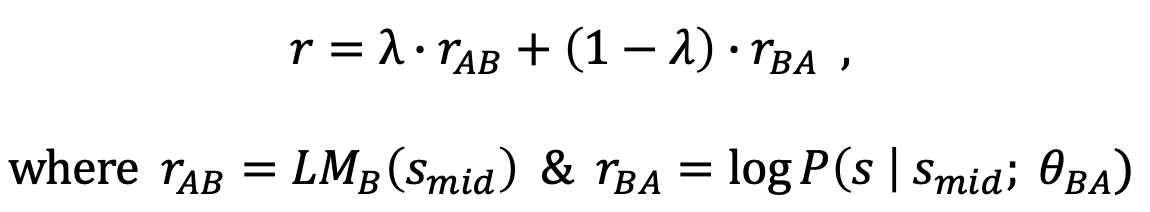 이제 k개의 sampling된 문장에 대해 각 방향에 대한 보상을 각각 구하고 이를 선형결합한다. (이때, smid: sampling된 문장을 의미) LMB를 사용해 해당 문장이 B언어의 집합에 속하는지 보상값을 계산한다. LMB는 기존 언어B단일코퍼스로 사전훈련되어있기에 자연스러운 문장이 생성될수록 해당 LM에서 높은 확률을 가질 것이다.
