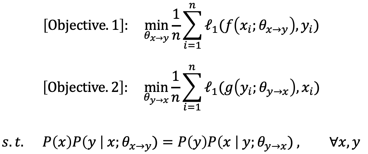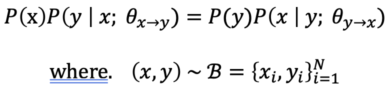 3.2 DUL (Dual Unsupervised Learning) 앞서 설명한 듀얼지도학습(DSL)은 Bayes정리에 따른 수식을 제약조건으로 사용했다. 지금 소개하는 논문[DUL ; 2018]의 방법은 주변분포(marginal distribution)의 성질을 이용해 제약조건을 생성한다.