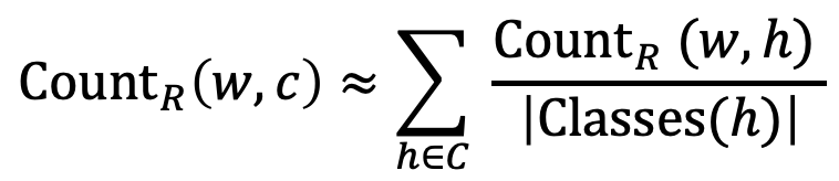 9.4 WordNet기반 Selection Preference 여기서 WordNet이 큰 위력을 발휘한다. WordNet을 이용하면 '차(car)'의 상위어를 알 수 있고 이를 클래스로하여 필요정보를 얻을 수 있다. 술어와 클래스사이 확률분포를 정의하는 출현빈도의 계산수식을 아래와 같이 정의할 수 있다. 클래스 c에 속하는 표제어(headword), 즉 h는 실제 corpus가 나타난 단어로 술어(predicate) w와 함께 출현한 h의 빈도를 세고, h가 속하는 클래스들의 집합의 크기인 |Classes(h)|로 나누어준다. 그리고 이를 클래스 c에 속하는 모든 표제어에 대해 수행한 후 이를 합한 값을 CountR(w,c)를 근사한다. 이를 통해 술어 w와 표제어 h가 주어졌을 때 h의 클래스 c를 추정한 c_hat을 구할 수 있다.
