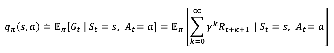 가치함수가 어떤 s에서 어떤 a를 선택할지와 관계없이 얻을 수 있는 누적보상의 기댓값이라 한다면 Q함수는 어떤 a를 선택하는가에 대한 개념이 추가된 것이다. 즉, 상태와 행동에 따른 기대누적보상을 나타내는 Q함수의 식은 아래와 같다.