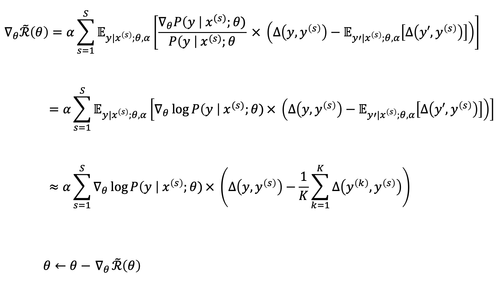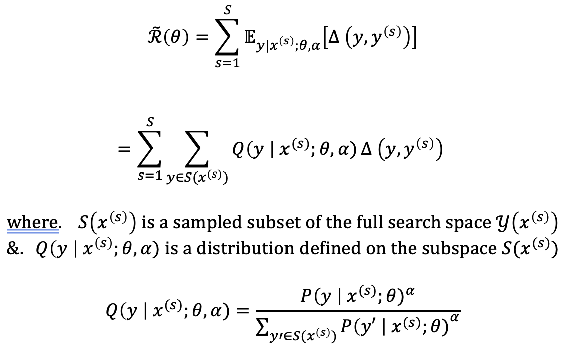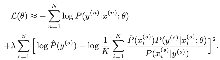 이처럼 중요도표집법(importance sampling)을 통해 tgt언어의 문장 y를 반대방향번역기 (y→x)에 넣어 K개의 src문장 x를 sampling해 P(y)를 구한다. 이 과정을 하나의 손실함수로 표현하면 아래와 같다.