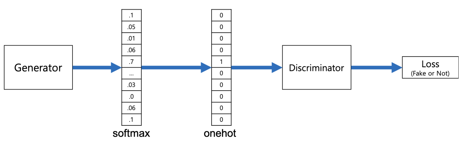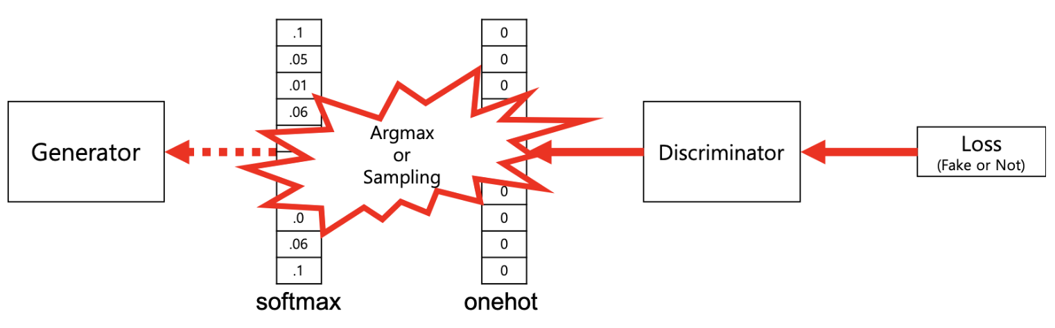 seq2seq의 결과는 이산확률분포이기 때문이다. 따라서 여기서 sampling이나 argmax로 얻어지는 결과물은 discrete한 값이기에 one-hot벡터로 표현되어야 할 것이다. 하지만 이 과정은 확률적인 과정(stochastic process)으로 기울기를 역전파할 수 없거나 미분 결과값이 0이나 불연속적인 경우가 되기에 D가 맞춘 여부를 역전파를 통해 seq2seq G로 전달될 수 없고, 결과적으로 학습이 불가능하다.