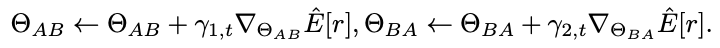 위의 알고리즘을 살펴보자. 두 도메인(A언어, B언어)의 문장들이 주어지고 생성자 GA→B의 parameter θAB와 반대방향 생성자 FB→A의 parameter θBA가 등장한다. 이 GA→B와 FB→A는 모두 parallel corpus를 활용해 pretrain된 상태이다. 앞에서 배운 Policy Gradient를 활용해 parameter를 update하면, 14번째 식이 도출된다.