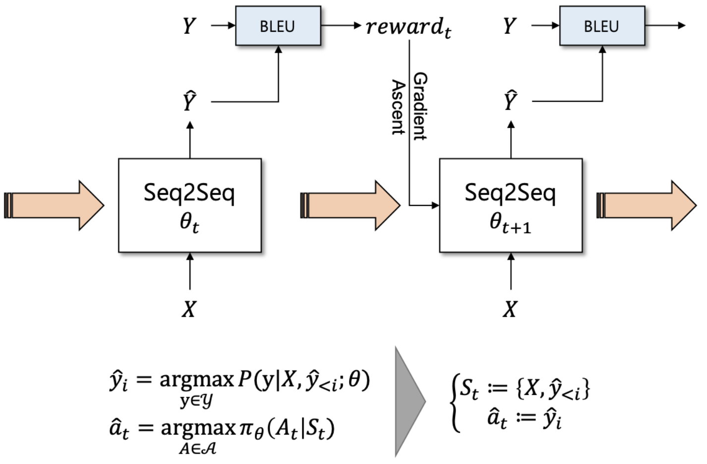 ∙episode를 반복해 문장생성경험을 축적 → 실제 정답과의 비교 → 기대누적보상을 최대화하도록 θ를 훈련