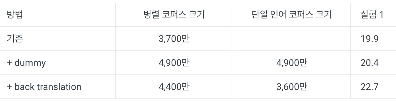 이 표에서 볼 수 있듯, DUL과 다른 기존 단일언어코퍼스를 활용한 알고리즘들과 비교한 결과는 위와 같은데, 이 방법은 앞서 소개한 기존의 단일언어코퍼스를 활용한 방식들과 비교했을 때, 훨씬 더 나은 성능의 개선을 보여준다.