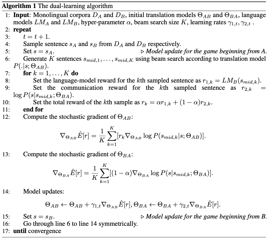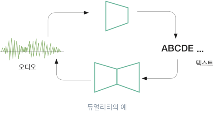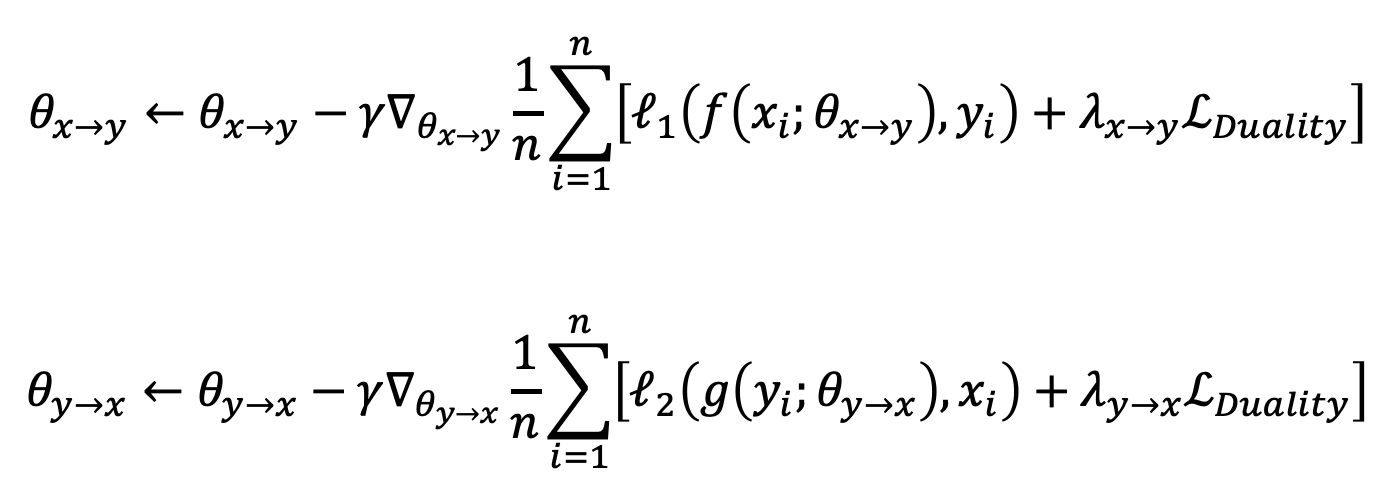 1.1 Duality란? 우린 보통 기계학습을 통해 특정 도메인의 data X를 받아 다른 도메인의 data Y로 mapping하는 함수를 근사하는 법을 학습한다. 따라서 대부분의 기계학습에 사용되는 dataset은 두 도메인 사이 data로 구성된다. Duality: 두 도메인 사이의 관계, 대부분의 기계학습문제는 이처럼 Duality속성을 갖는다. 특히나 NMT는 각 도메인의 data사이에 정보량의 차이가 거의 없다는 점이 큰 특징이자 장점인데, Duality를 적극적으로 활용한다면 기계번역을 고도화할 수 있다.