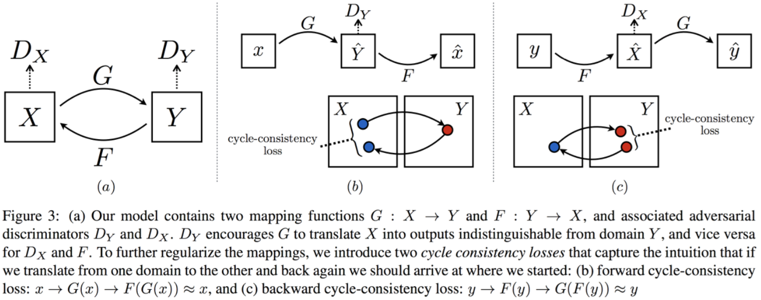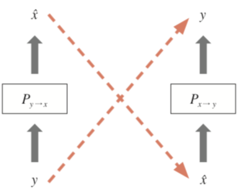 이 방식의 핵심은 x̂ 나 ŷ를 합성할 때, 기존의 도메인 X, Y에 실제로 속하는 이미지처럼 만들어 내야 한다는 것이다. 그리고 각각의 x̂ 와 ŷ로부터 원래 data로 돌아올 수 있어야 한다는 것이다.