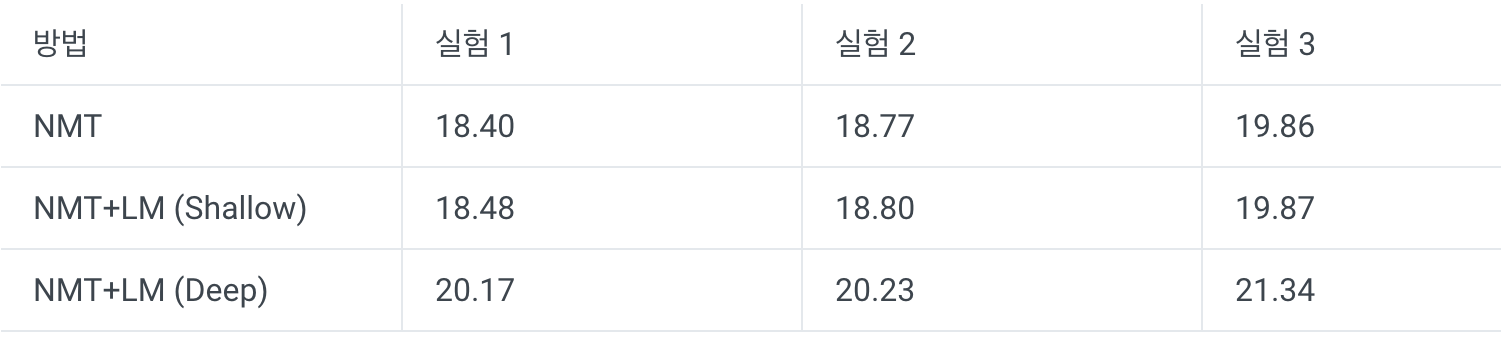 ∙2항: 단일언어코퍼스에서 주어진 문장 ys LM에서의 확률값 log p̂(ys)과의 차이를 줄여야한다. 그 값은 반대방향번역기(y→x)를 통해 K번 sampling한 문장 xi의 LM확률값 p̂(xi)와 xi가 주어질 때, ys의 확률값을 곱하고, 문장 ys가 주어졌을 때 sampling한 문장 xi의 확률값으로 나눠준 값이 된다. [성능 및 결과]