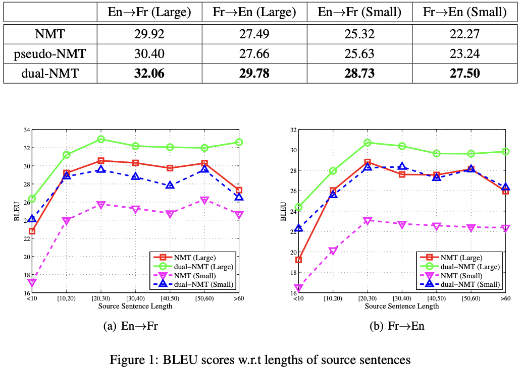최종적인 성능에 대한 설명 및 결과는 위와 같다. Dual-Learning이 문장길이에 상관없이 항상 높은 성능을 보임을 알 수 있다.