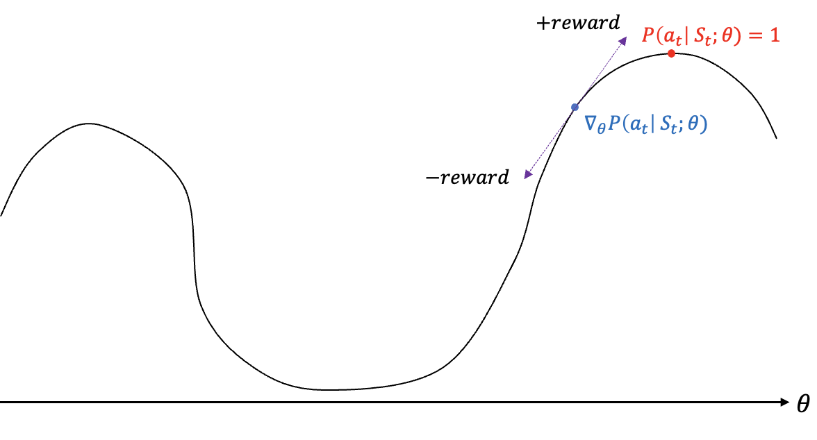 하지만 음의 보상값을 받게된다면, 경사의 반대방향으로 step을 갖게 값이 곱해질 것이므로 경사하강법을 수행하는 것과 같은 효과가 발생할 것이다. 따라서 해당 sampling된 a들이 앞으로는 잘 나오지 않게 신경망 파라미터 θ가 update될 것이다. 따라서 실제 보상을 최대화하는 행동의 확률을 최대로하는 파라미터 θ를 찾도록 할것이다.