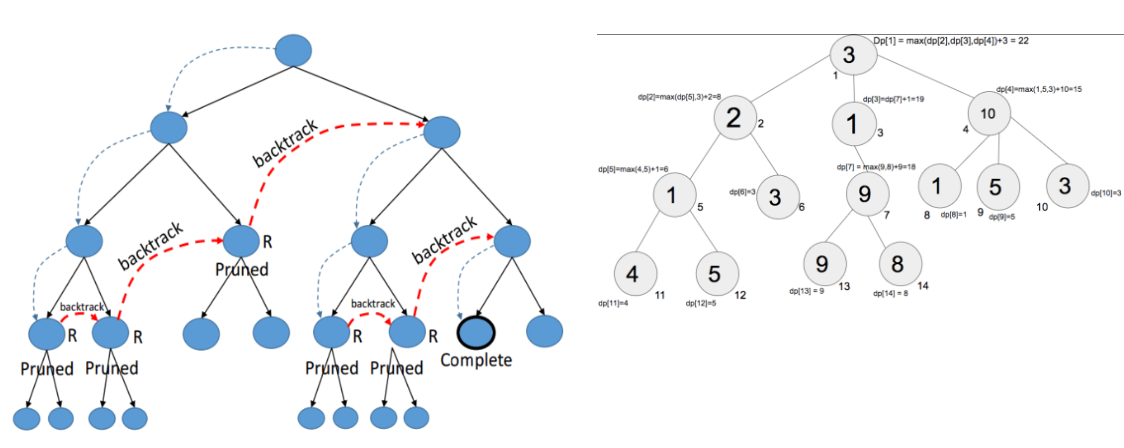 Bellman방정식은 동적프로그래밍(DP; Dynamic Programming)알고리즘 문제로 접근가능하다. 즉, 단순히 최단경로를 찾는 문제와 비슷한데, 아래 그림처럼 모든 경우에 대해 탐색을 수행하는 Back-Tracking보다 훨씬 효율적이고 빠르게 문제풀이에 접근할 수 있다.