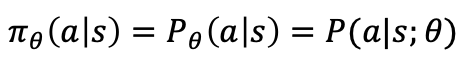 정책(policy)은 Agent가 상황에 따라 어떻게 행동을 해야할 지, "확률적으로 나타낸 기준"이다. 즉, 같은 상황이 주어졌을 때, 어떤 행동을 선택할지에 대한 확률함수이기에 따라서 우리가 행동하는 과정은 확률적인 프로세스라 볼 수 있다. 이때, 함수를 통해 주어진 행동을 취할 확률값을 아래 함수를 통해 구할 수 있다.