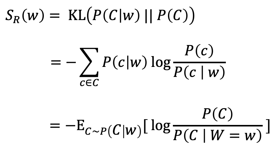 이를 KLD(KL-Divergence)를 사용해 정의하였다. 선택선호도 강도 SR(w)은 w가 주어졌을 때, 목표클래스 C의 분포 P(C|w)와 그냥 해당 클래스들의 사전분포 P(C)와의 KLD로 정의되어 있음을 알 수 있다. (즉, 특정 클래스를 얼마나 선택적으로 선호하는지를 알 수 있다.)